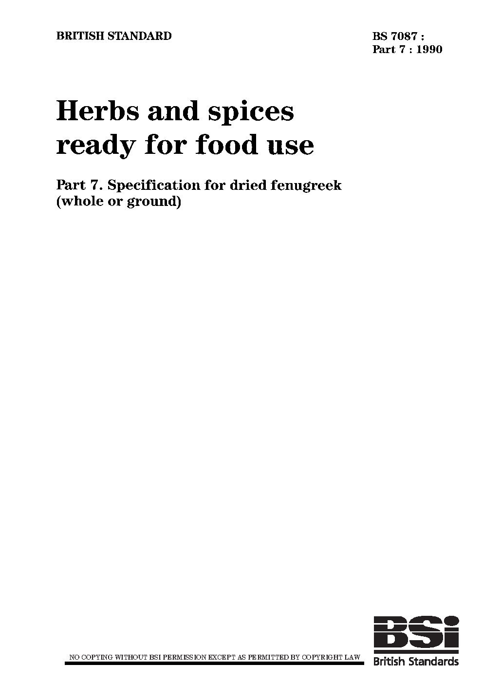 Herbs and spices ready for food use Specification dried fenugreek (whole or ground)