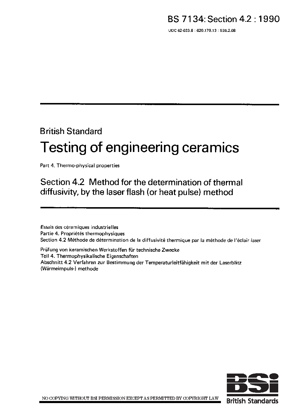 Testing of engineering ceramics. Thermo-physical properties Method for the determination thermal diffusivity, by laser flash (or heat pulse) method