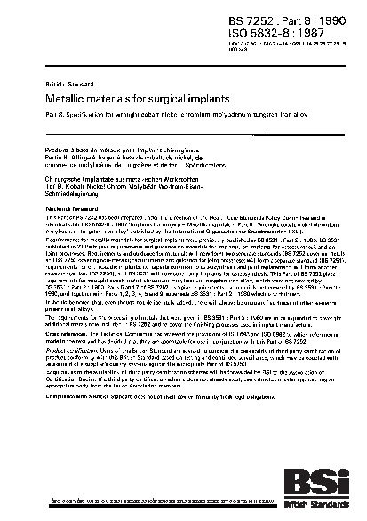 Metallic materials for surgical implants Specification wrought cobalt-nickel-chromium-molybdenum-tungsten-iron alloy