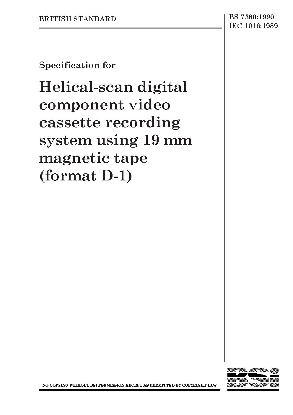 Specification for helical-scan digital component video cassette recording system using 19 mm magnetic tape (format D-1)