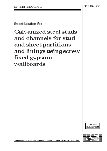 Specification for galvanized steel studs and channels for stud and sheet partitions and linings using screw fixed gypsum wallboards
