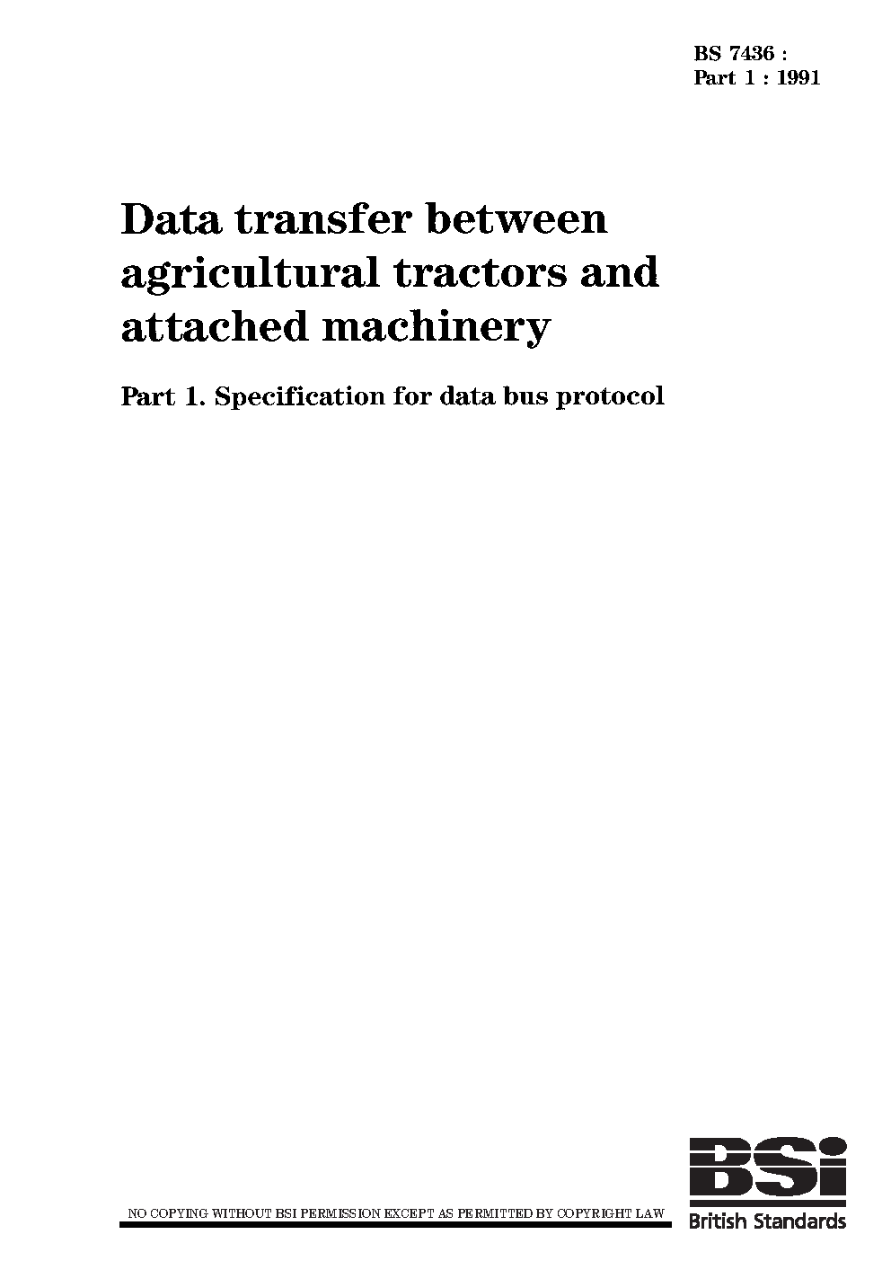 Data transfer between agricultural tractors and attached machinery Specification for data bus protocol