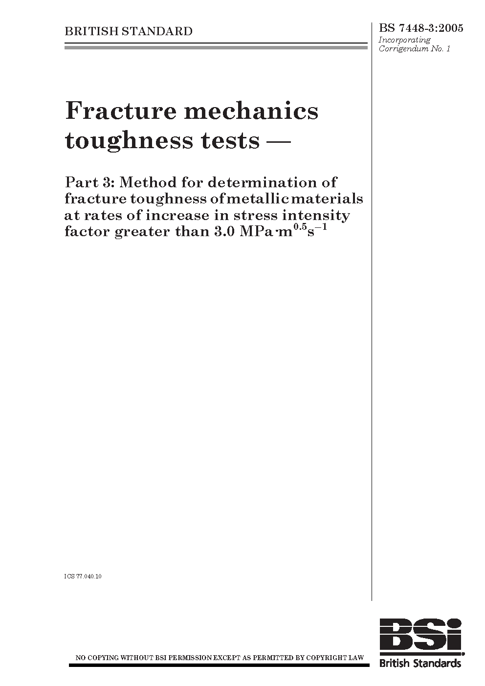 Fracture mechanics toughness tests Method for determination of fracture metallic materials at rates increase in stress intensity factor greater than 3.0 MPa m0.5 s-1
