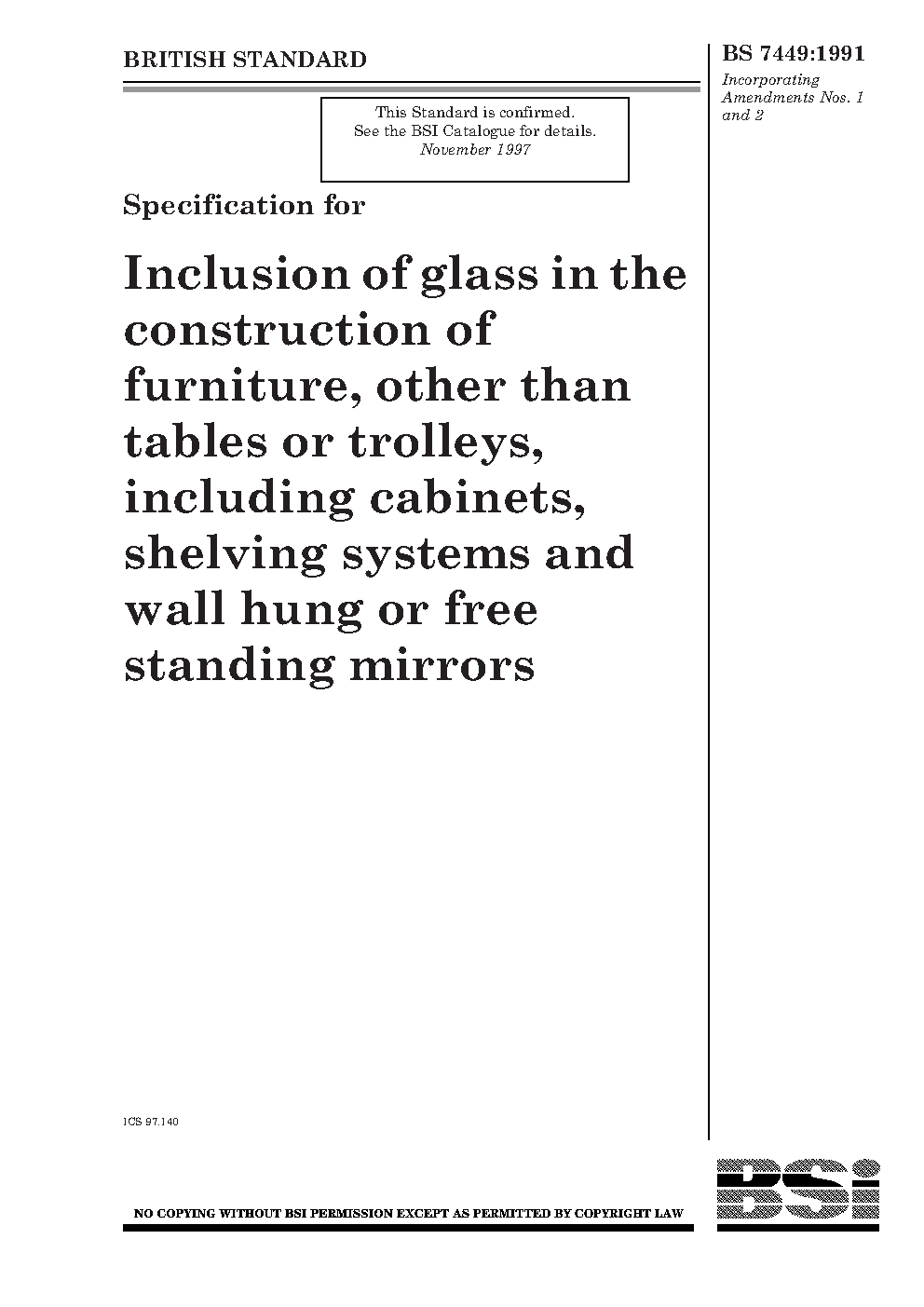 Specification for inclusion of glass in the construction of furniture, other than tables or trolleys, including cabinets, shelving systems and wall hung or free standing mirrors