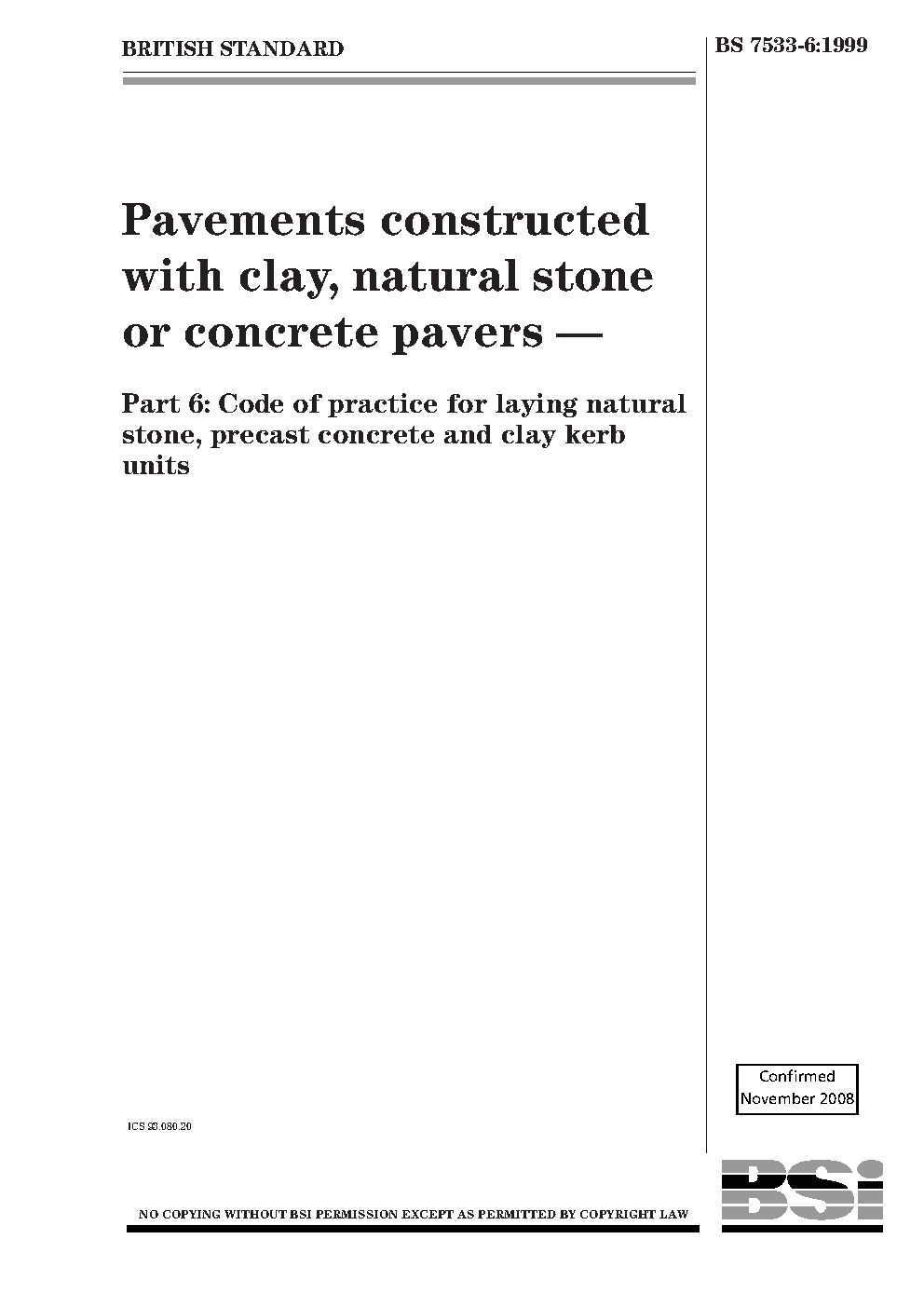 Pavements constructed with clay, natural stone or concrete pavers Code of practice for laying stone, precast and clay kerb units