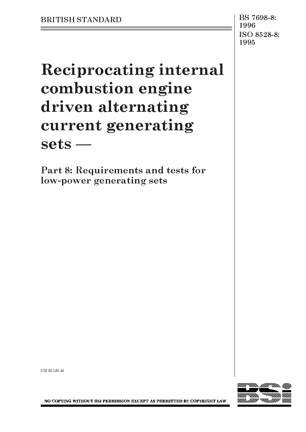 Reciprocating internal combustion engine driven alternating current generating sets Requirements and tests for low-power