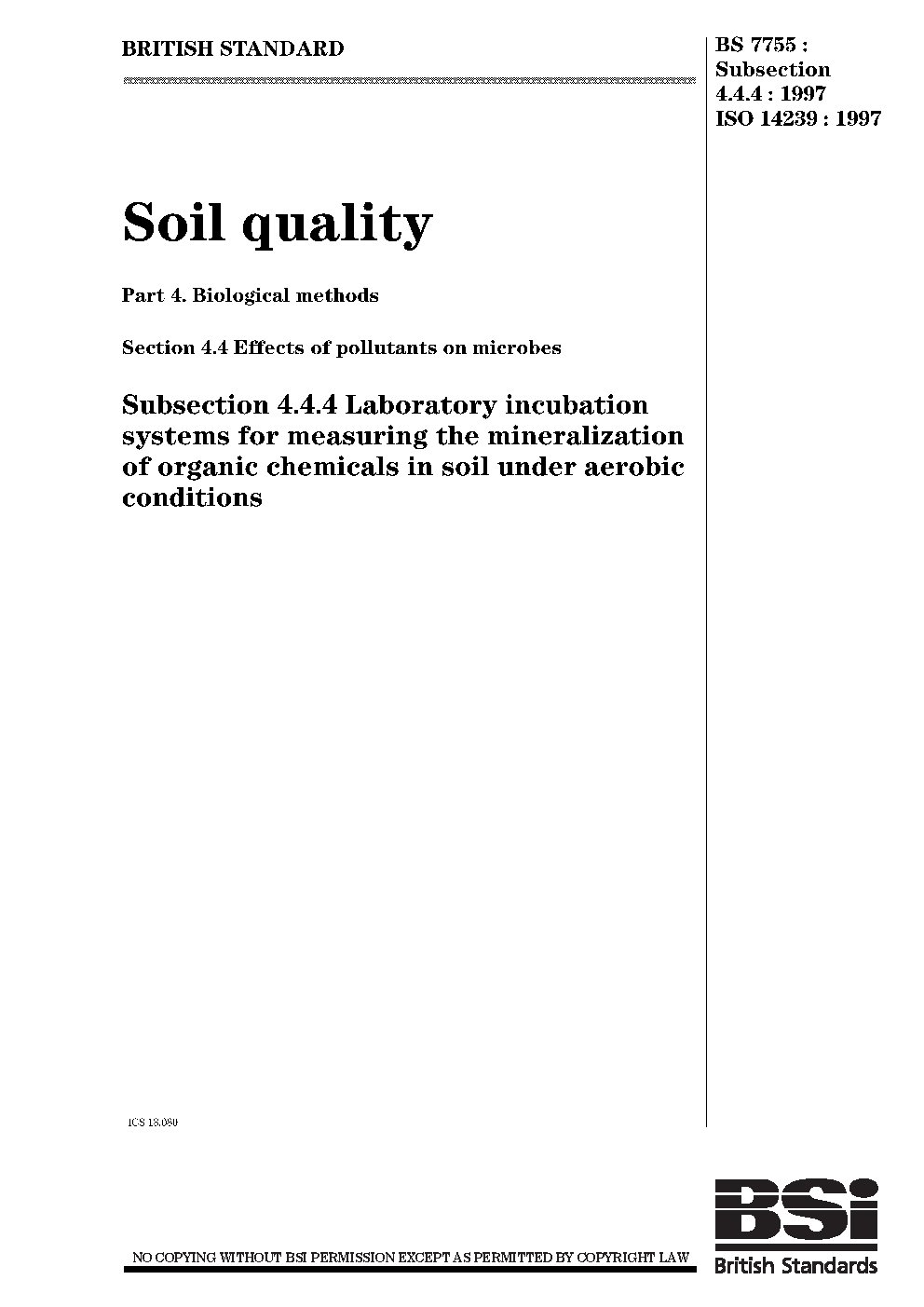 Soil quality. Biological methods. Effects of pollutants on microbes Laboratory incubation systems for measuring the mineralization organic chemicals in soil under aerobic conditions