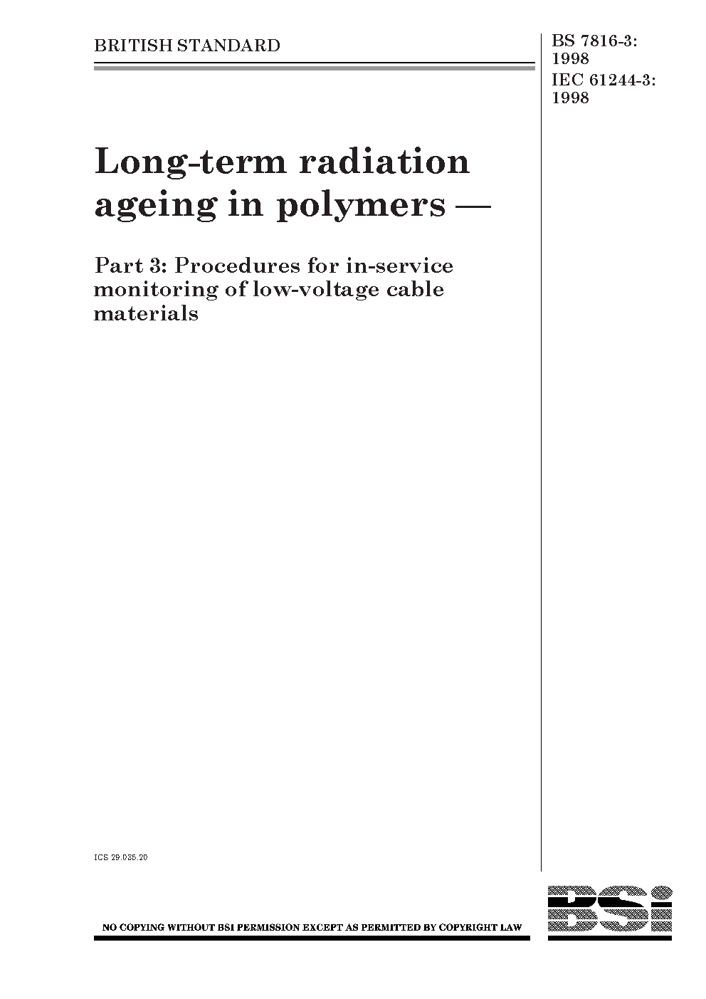 Determination of long-term radiation ageing in polymers Procedures for in-service monitoring low-voltage cable materials