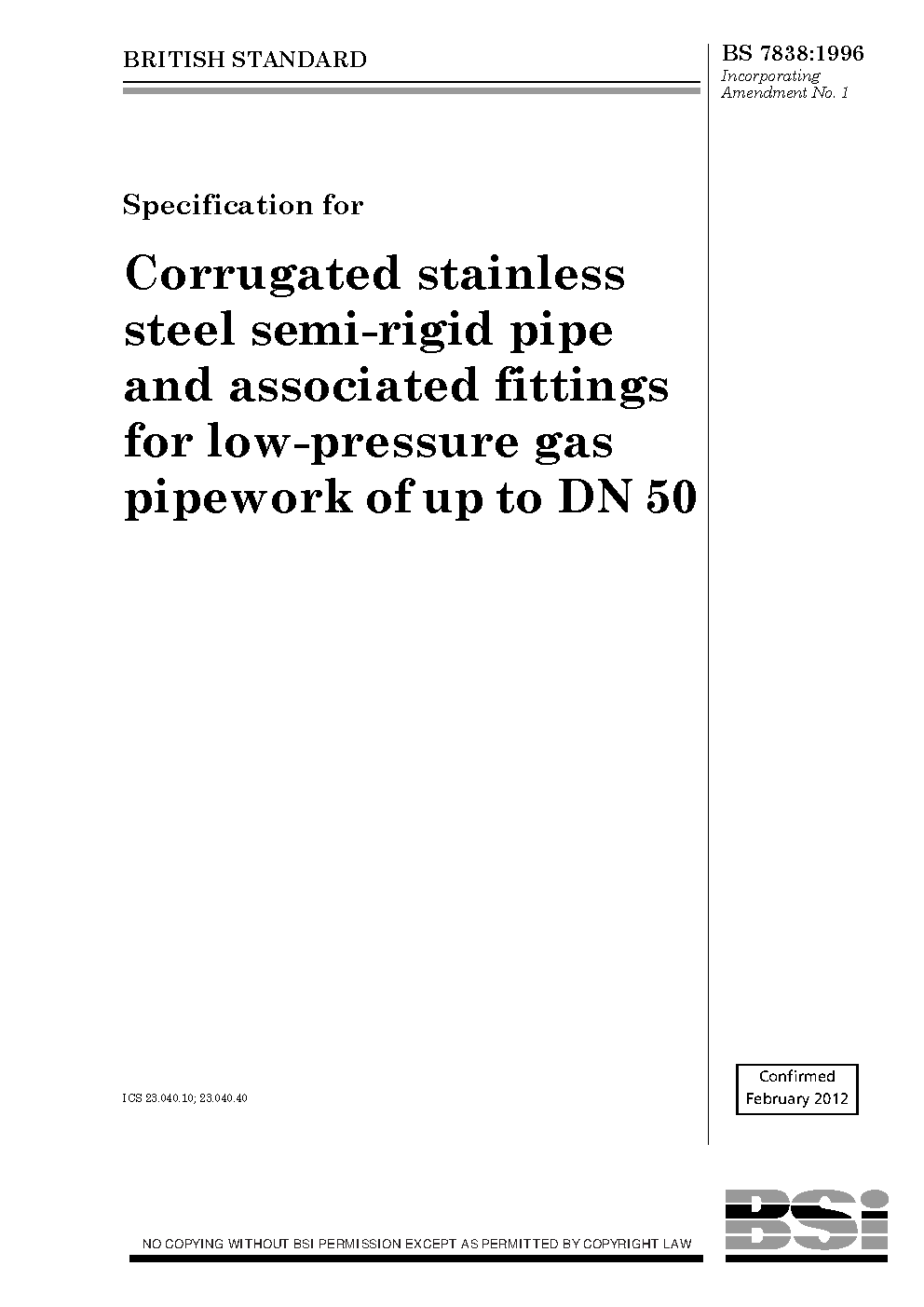 Specification for corrugated stainless steel semi-rigid pipe and associated fittings for low-pressure gas pipework of up to DN 50