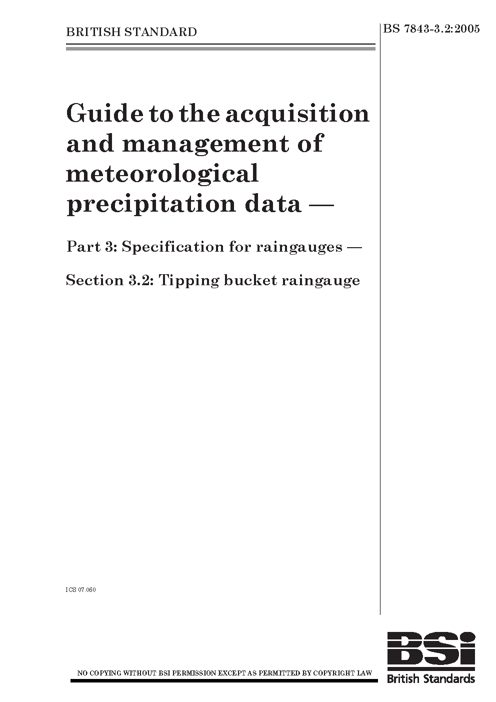Guide to the acquisition and management of meteorological precipitation data Specifcation for raingauges Tipping bucket gauges