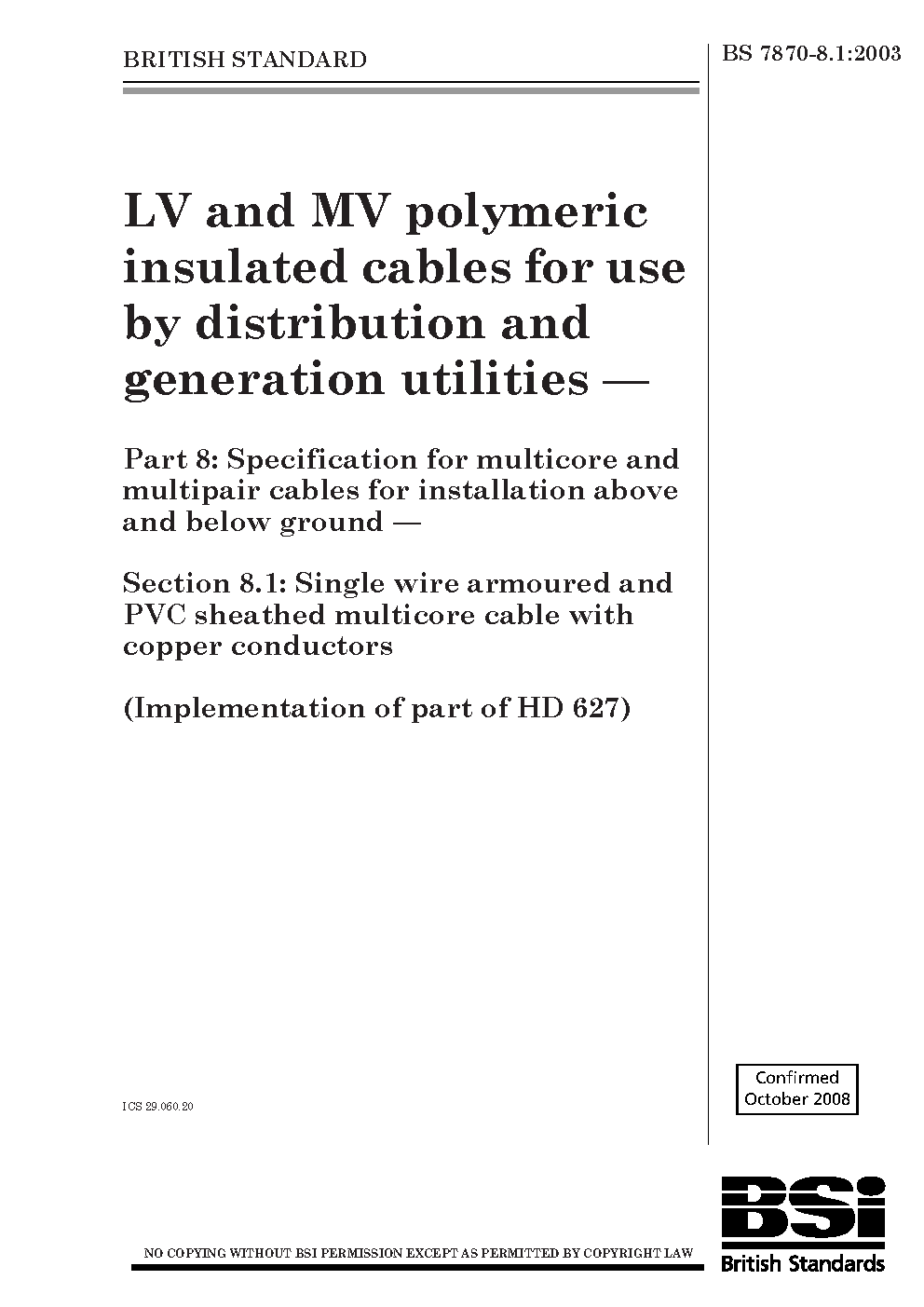 LV and MV polymeric insulated cables for use by distribution generation utilities. Specification multicore multipair installation above below ground Single wire armoured PVC sheathed cable with copper conductors Section 8.1