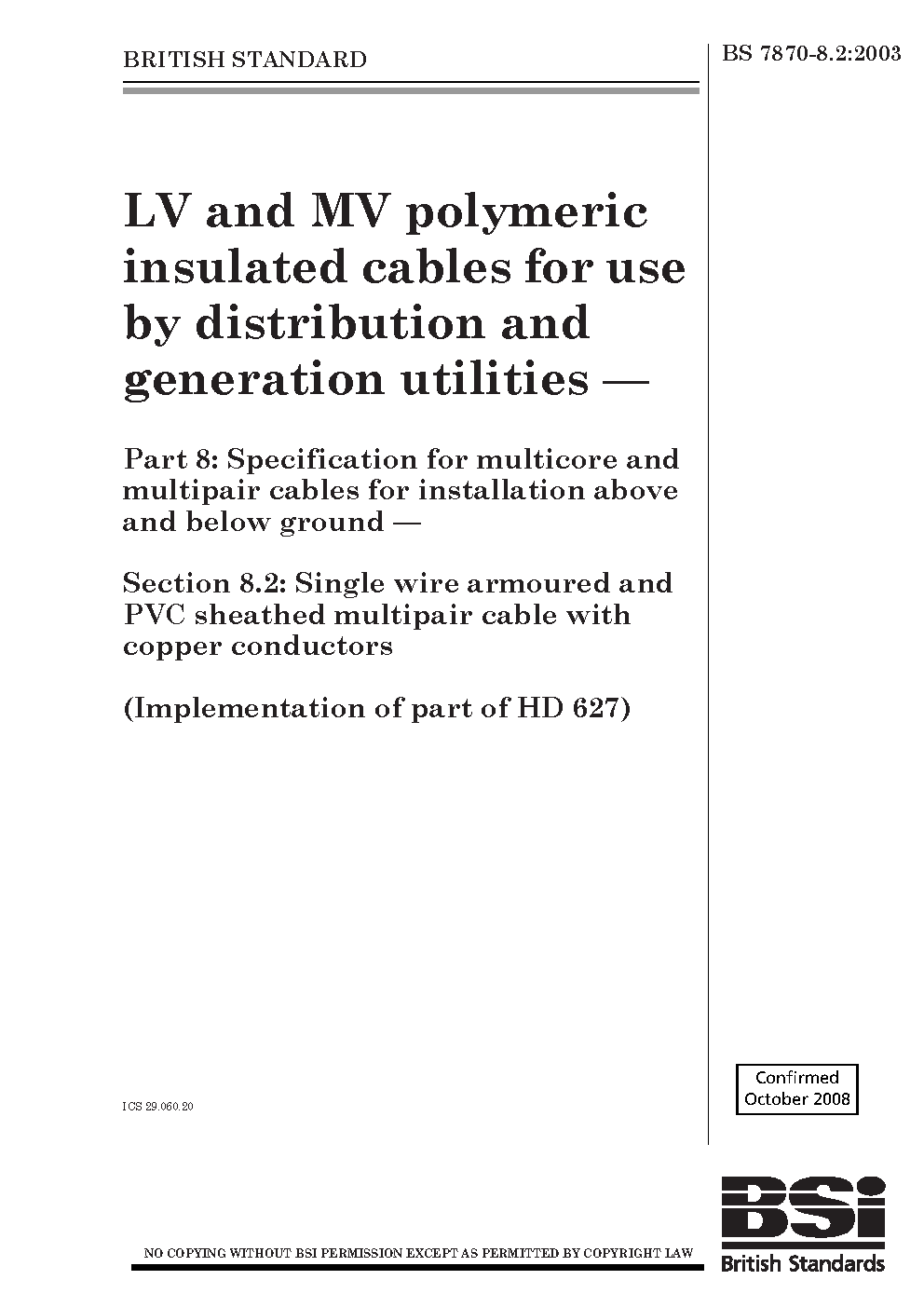 LV and MV polymeric insulated cables for use by distribution generation utilities. Specification multicore multipair installation above below ground Single wire armoured PVC sheathed cable with copper conductors Section 8.2
