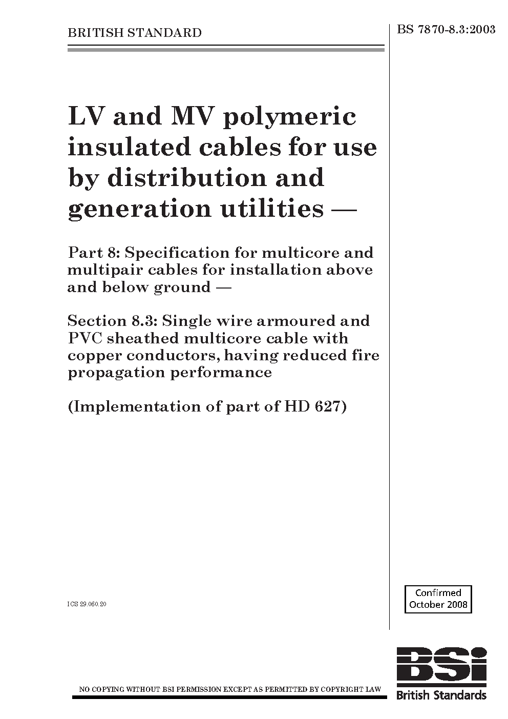 LV and MV polymeric insulated cables for use by distribution generation utilities. Specification multicore multipair installation above below ground Single wire armoured PVC sheathed cable with copper conductors, having reduced fire propagation performance Section 8.3