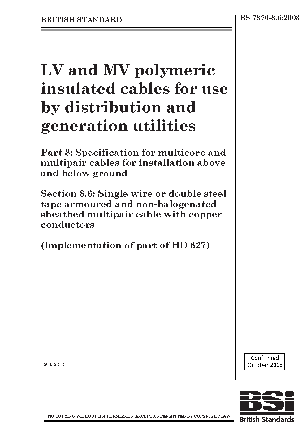 LV and MV polymeric insulated cables for use by distribution generation utilities. Specification multicore multipair installation above below ground Single wire or double steel tape armoured non-halogenated sheathed cable with copper conductors Section 8.6
