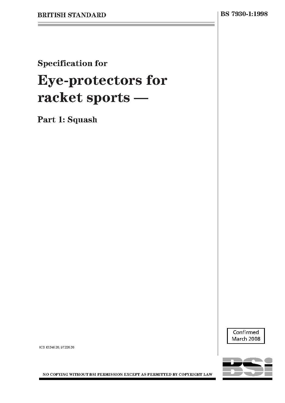 Protective clothing;Sports equipment;Field of vision;Squash equipment;Transmittance;Defects;Sports clothing;Eye protectors;Impact testing;Polycarbonates;Testing conditions;Optical properties of materials;Marking;Tolerances (measurement);Spectacle lenses;Instructions for use;Safety measures;Impact strength;Design;Corrosion resistance