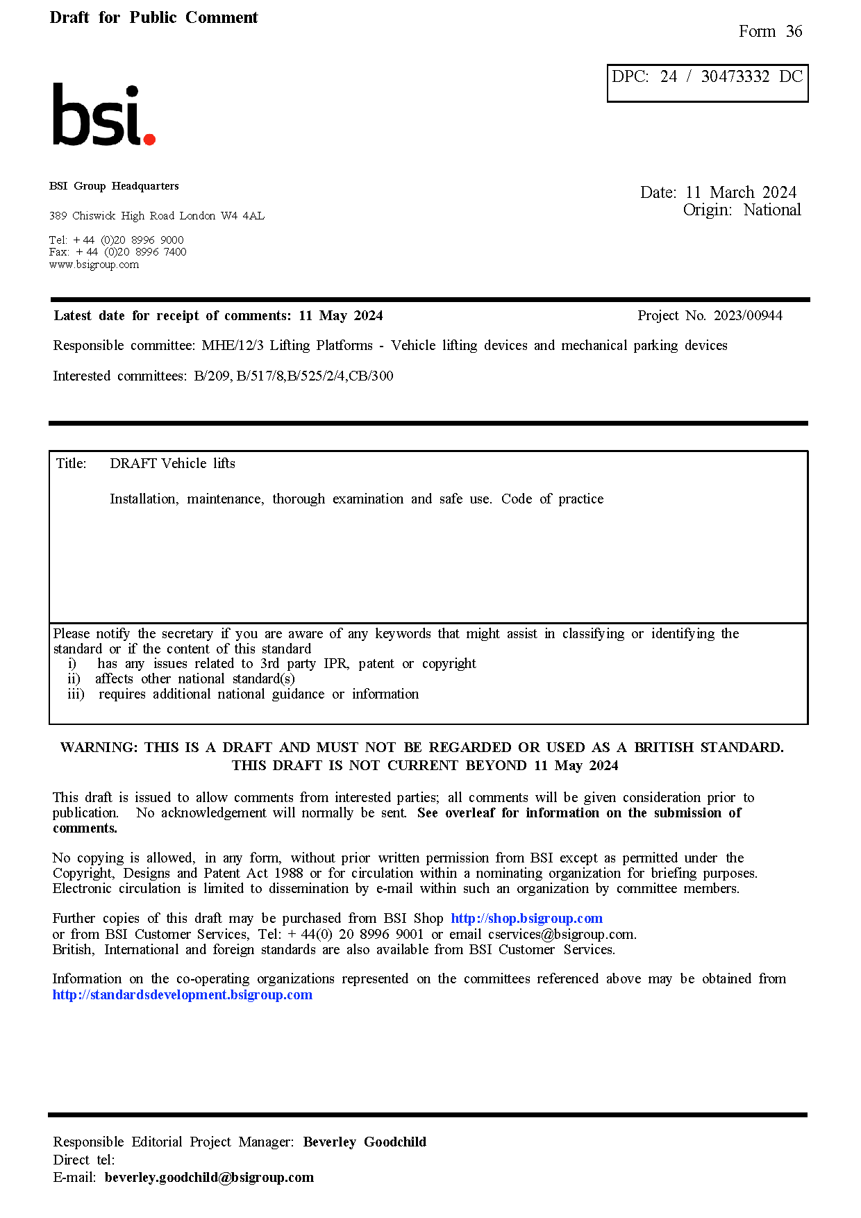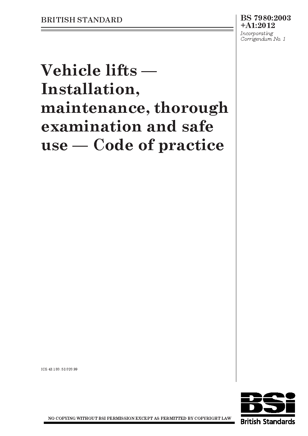 Vehicle lifts. Installation, maintenance, thorough examination and safe use. Code of practice