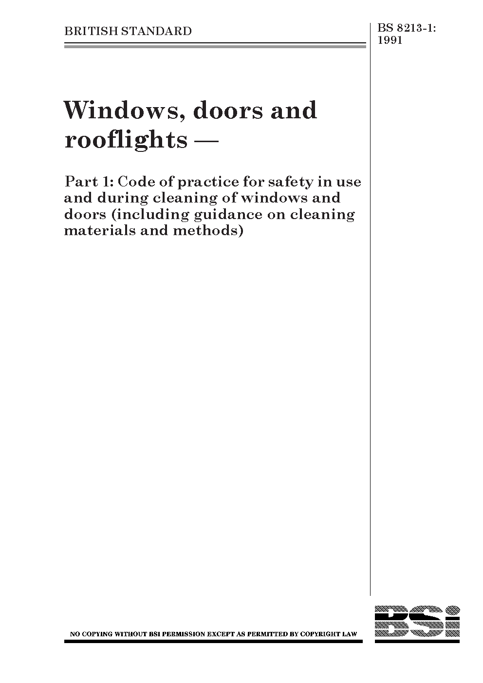 Windows doors and rooflights Design for safety in use during cleaning of windows, including door-height windows roof windows. Code practice