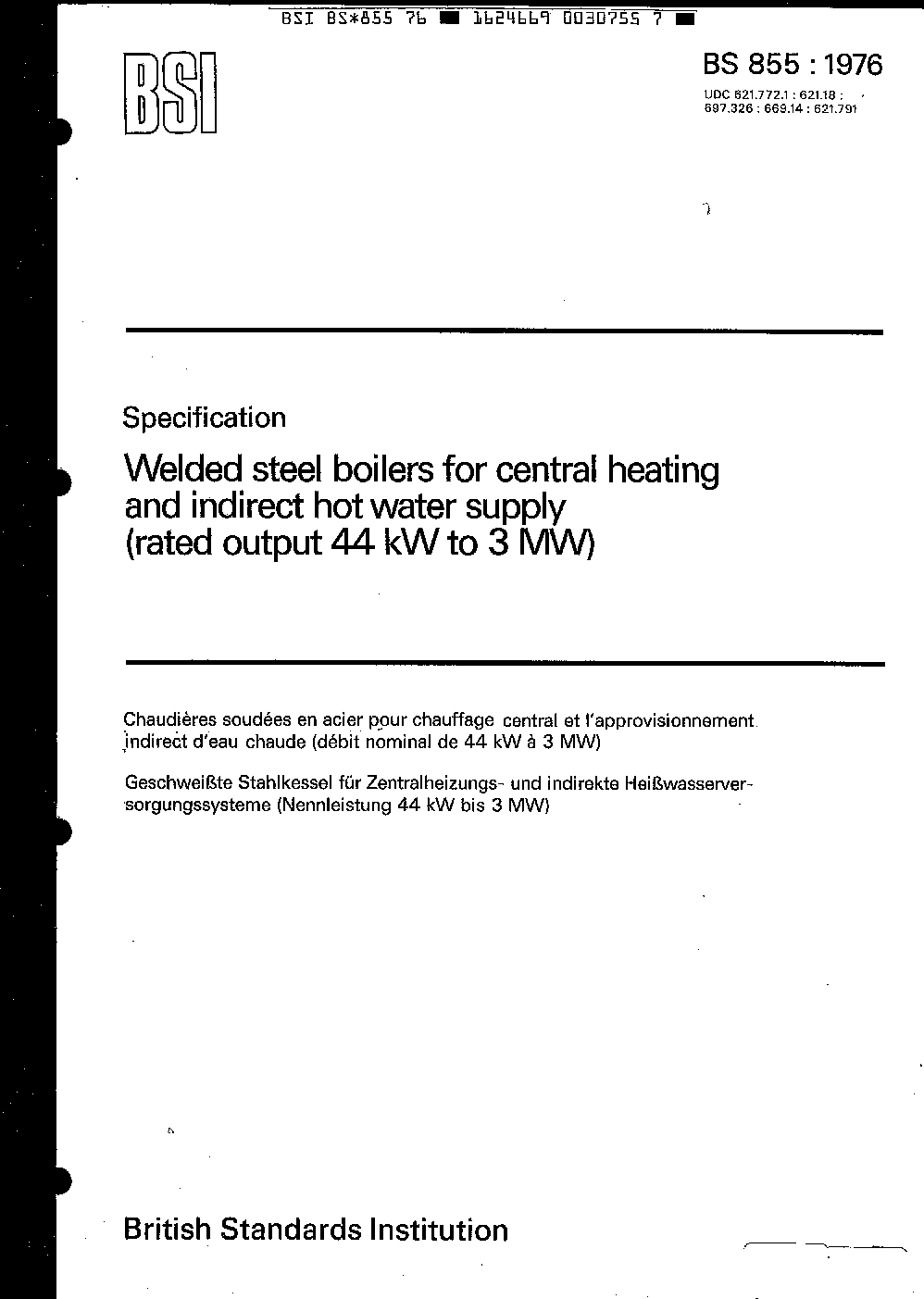 Specification for welded steel boilers for central heating and indirect hot water supply (rated output 44 kW to 3 MW)