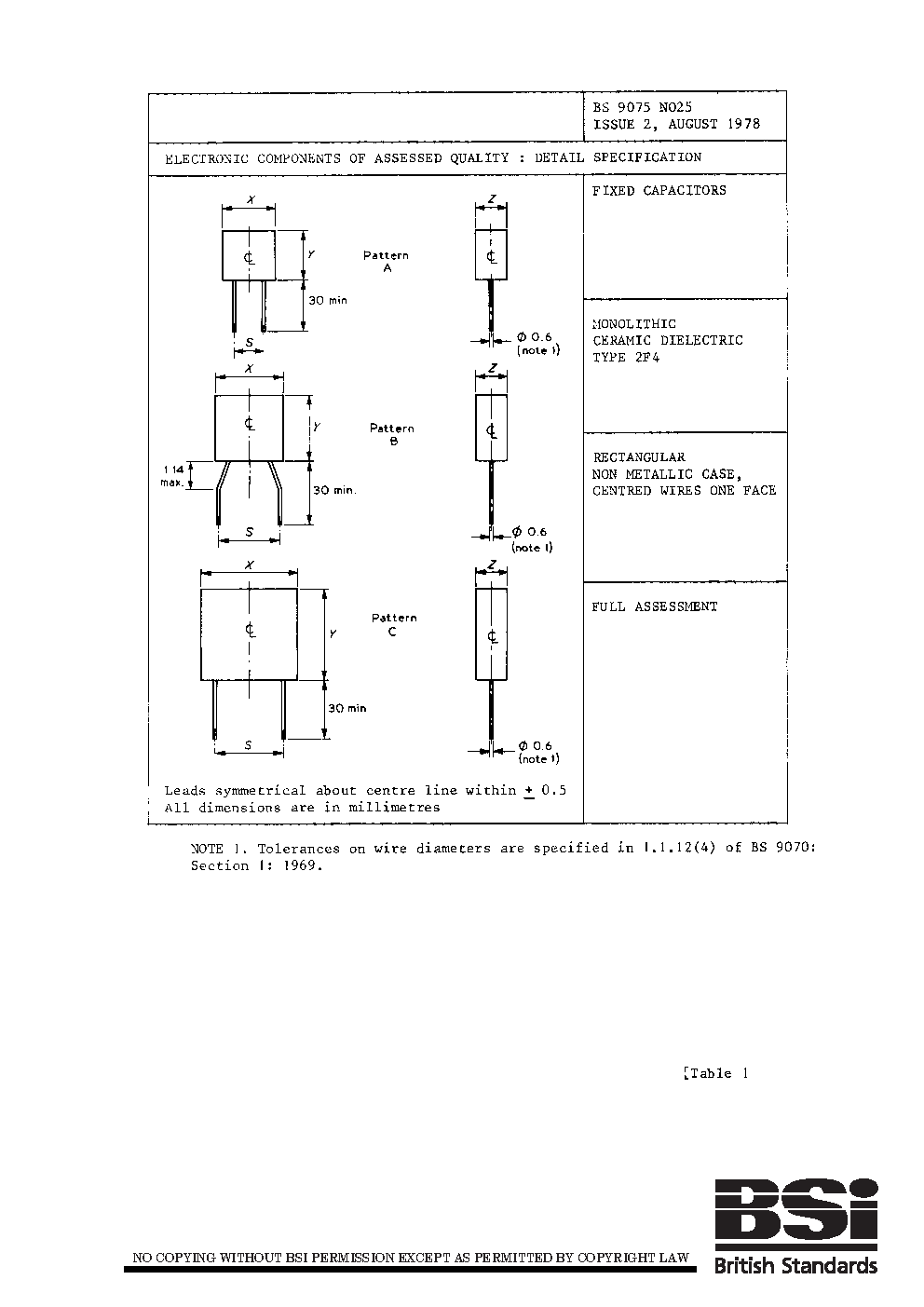 Detail specification for fixed monolithic ceramic dielectric capacitors (type 2F4). Rectangular non-metallic case, centred wires on one face. Full assessment level