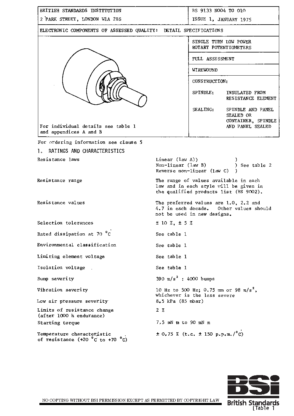 Detail specification for single turn low power wirewound rotary potentiometers. Spindle insulated from resistance element, spindle and panel sealed or container, spindle and panel sealed. Full assessment level
