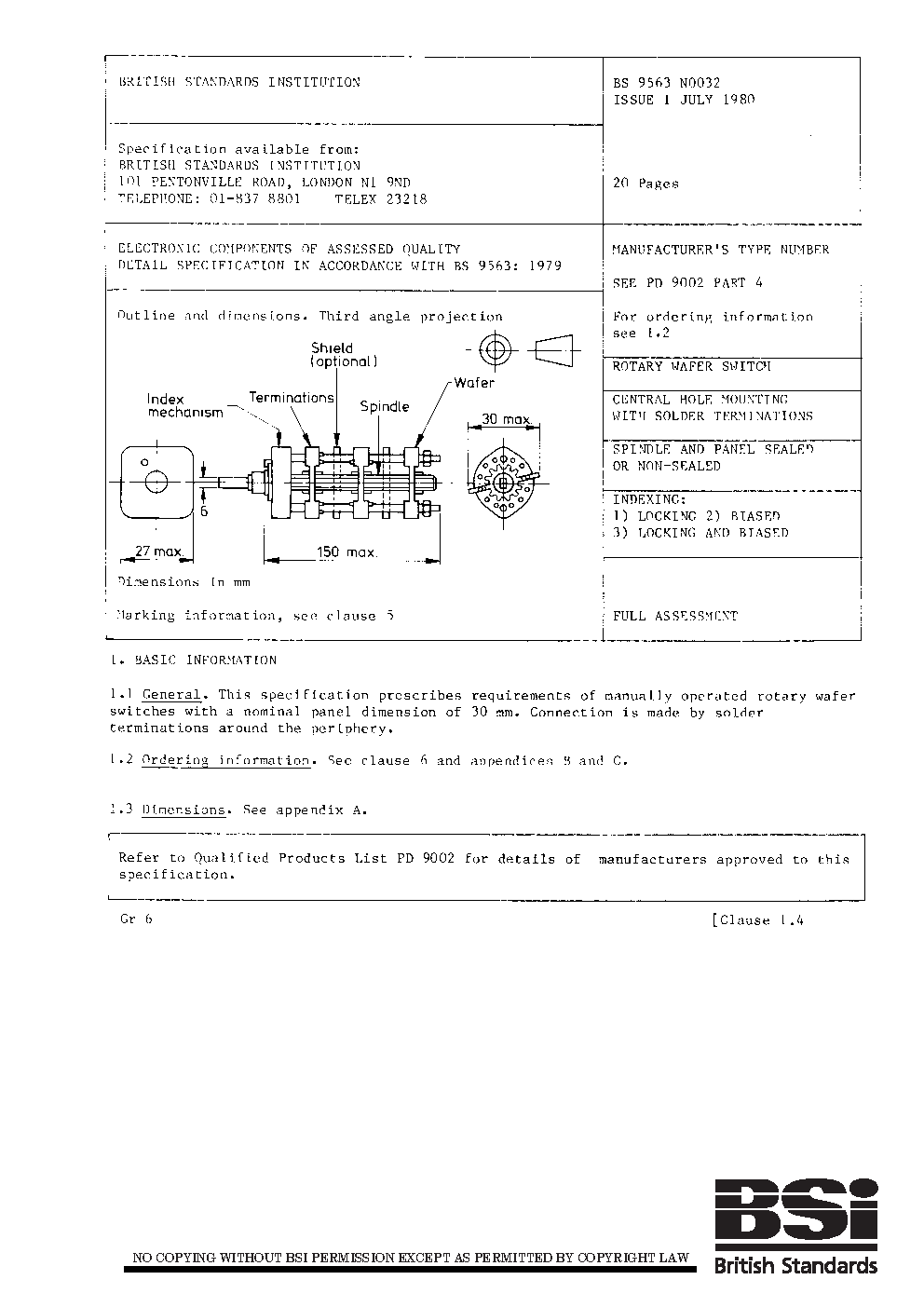 Detail specification for rotary wafer switch (manual). 30 mm central hole mounting, spindle and panel sealed or non-sealed, solder terminations. Full assessment level