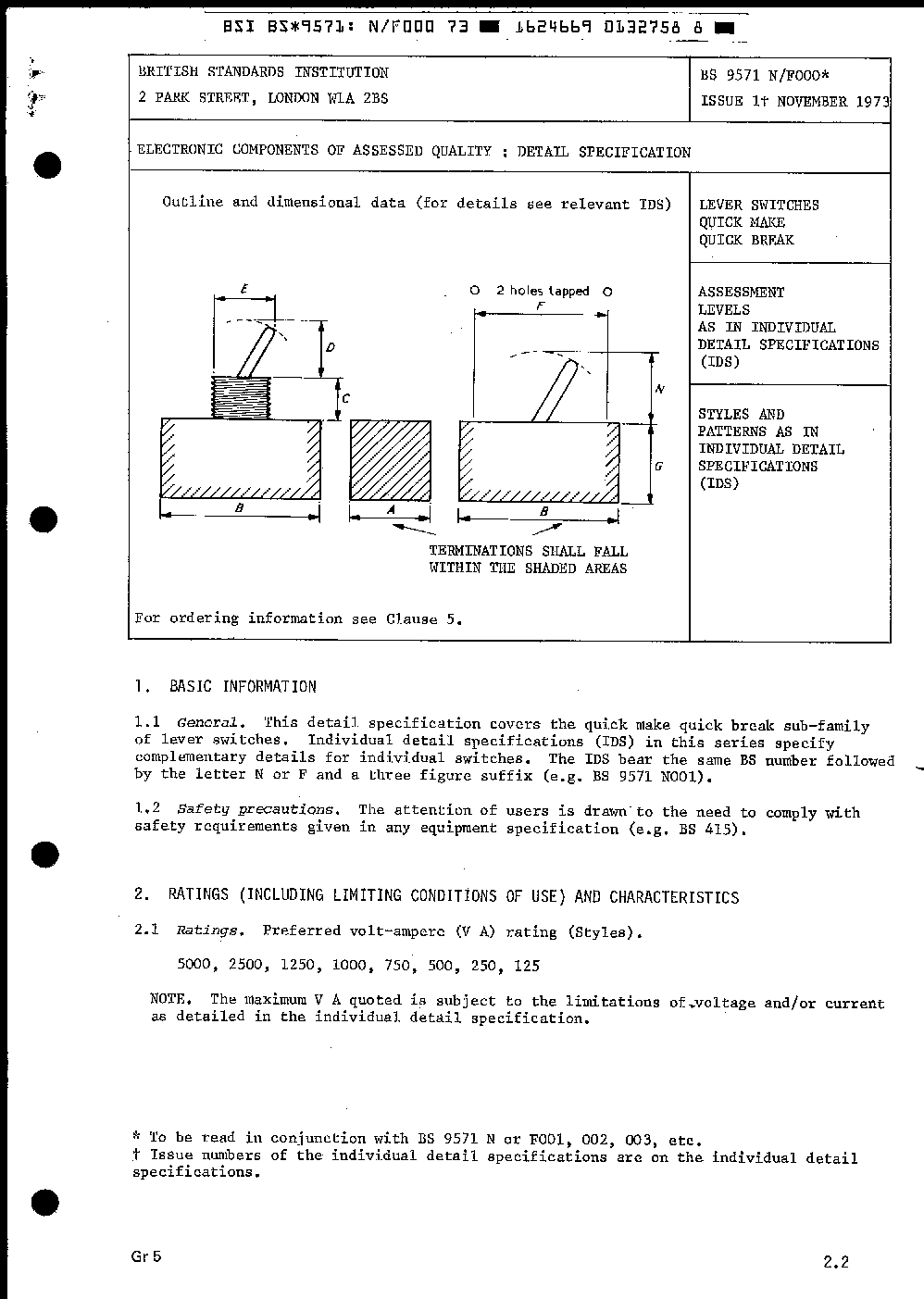 Detail specification for lever operated switches, quick-make quick-break. Assessment levels as in individual detail specifications