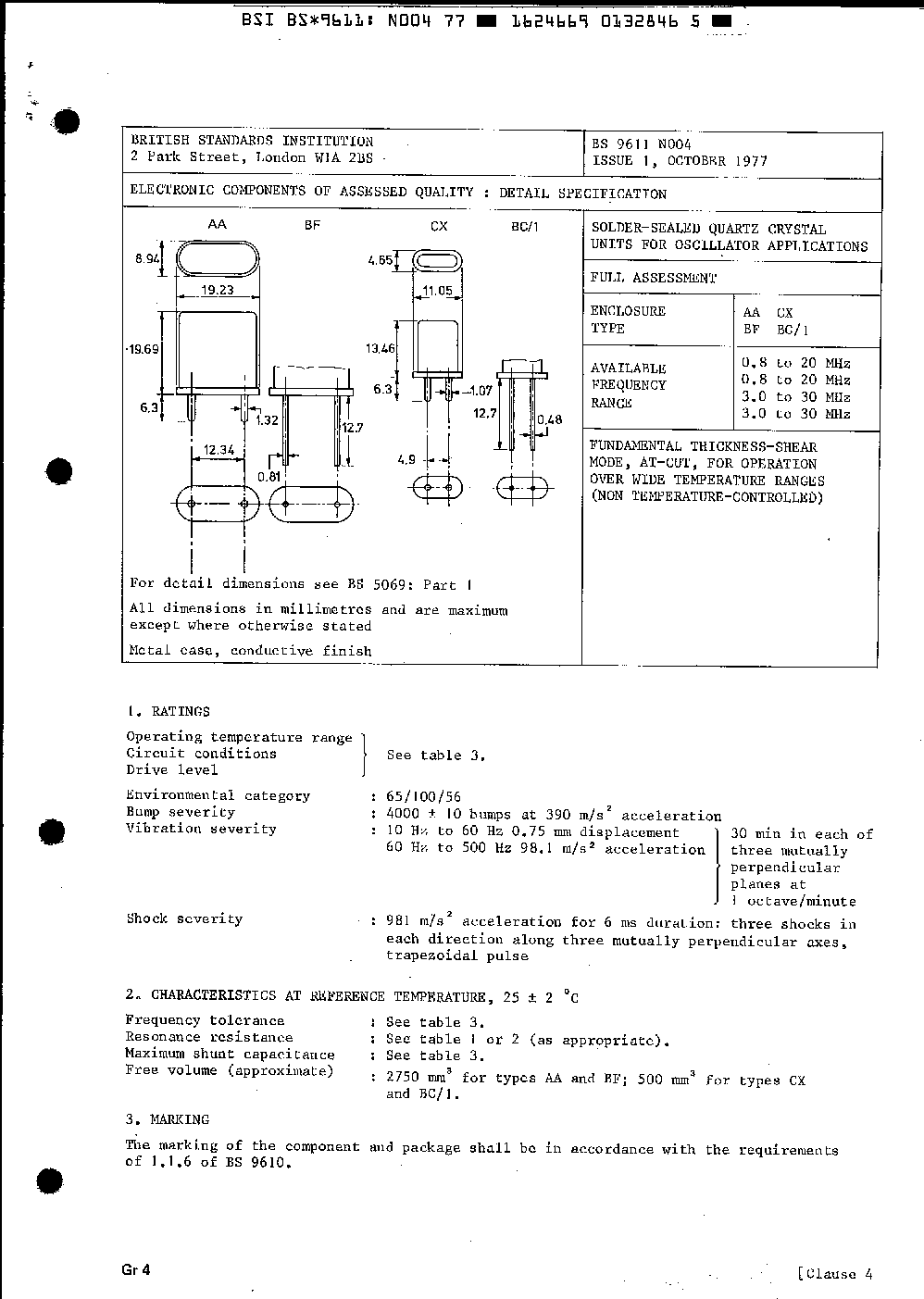 Detail specification for solder-sealed quartz crystal units for oscillator applications. AA, BF, CX and BC/1 enclosures, 0.8 to 20 MHz and 3.0 to 30 MHz frequency ranges. Fundamental thickness-shear mode, AT-cut, for operation over wide temperature ranges (non-temperature controlled). Full assessment level