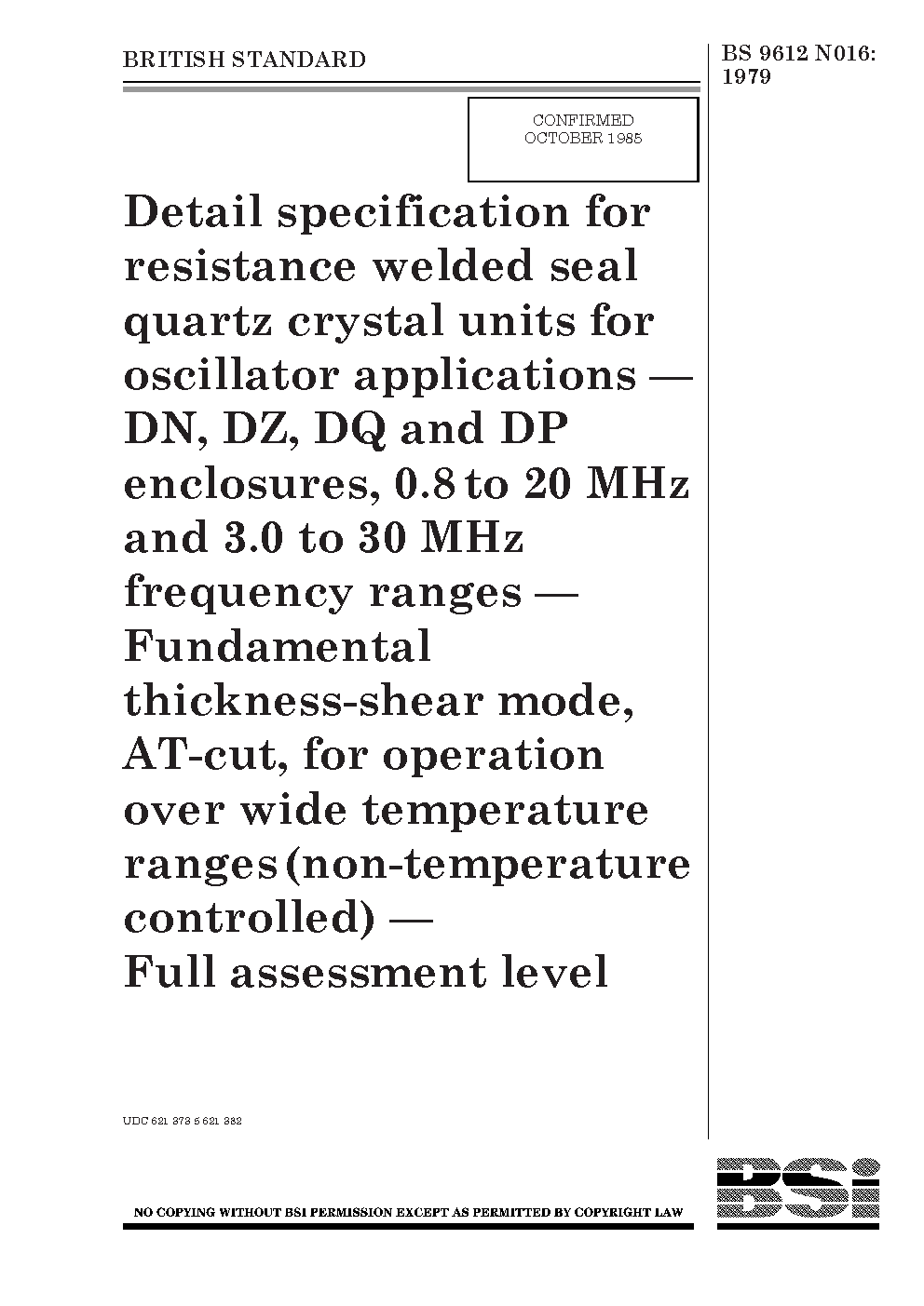Detail specification for resistance welded seal quartz crystal units for oscillator applications. DN, DZ, DQ and DP enclosures, 0.8 to 20 MHz and 3.0 to 30 MHz frequency ranges. Fundamental thickness-shear mode, AT-cut, for operation over wide temperature ranges (non-temperature controlled). Full assessment level