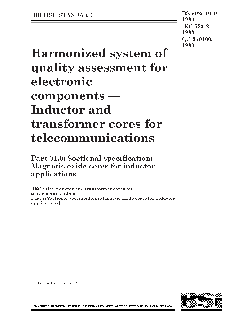 Harmonized system of quality assessment for electronic components. Inductor and transformer cores telecommunications Sectional specification: magnetic oxide inductor applications
