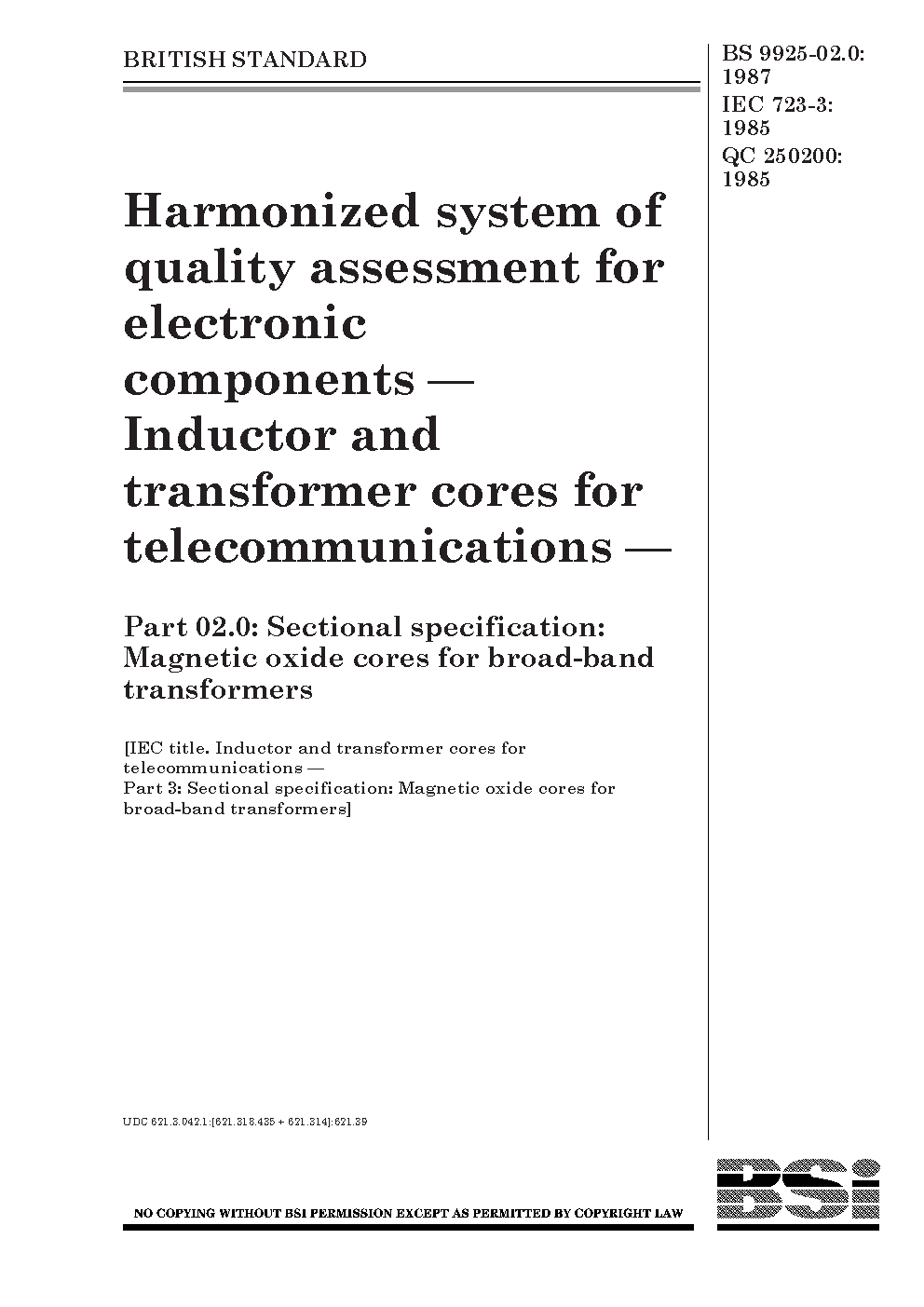 Harmonized system of quality assessment for electronic components. Inductor and transformer cores telecommunications Sectional specification: magnetic oxide broad-band transformers