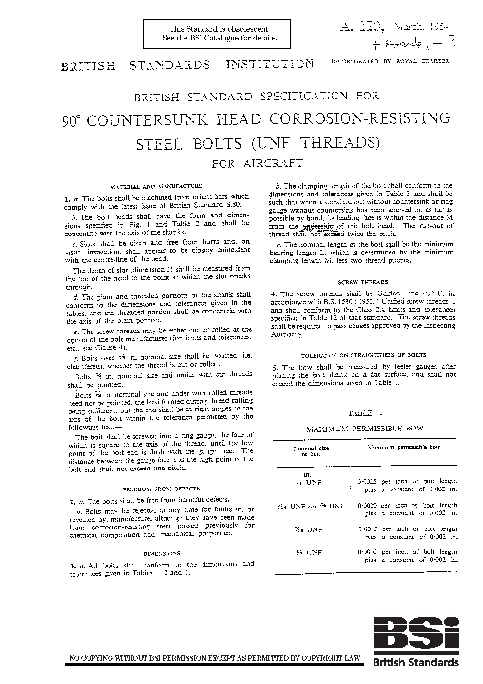 Specification for 90° countersunk head corrosion-resisting steel bolts (UNF threads) for aircraft