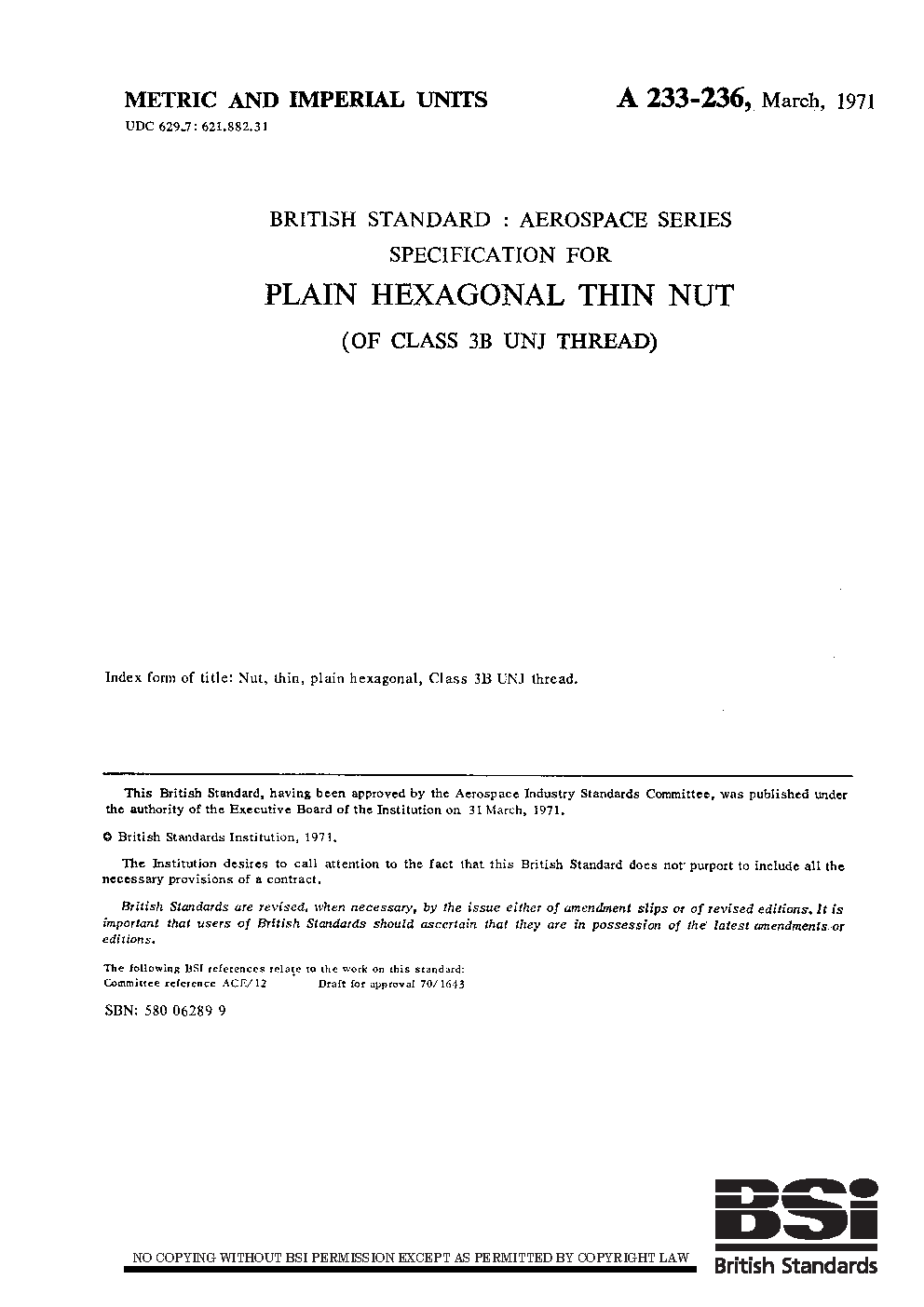 Specification for plain hexagonal thin nut (of Class 3B UNJ thread)