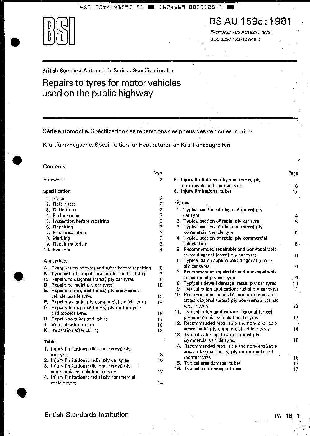 Specification for repairs to tyres for motor vehicles used on the public highway