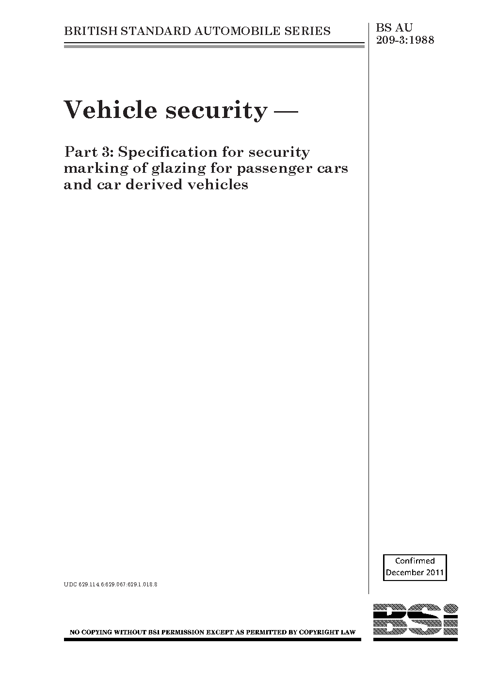 Anti-burglar measures;Vehicle windows;Vehicle components;Road vehicles;Passenger road vehicles;Codes;Private cars;Size;Position;Marking;Glazing;Engraving;Legibility;Security marking;Depth