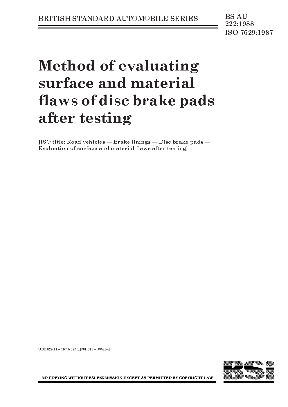 Defects;Brake linings;Surface texture;Surface defects;Flaw detection;Disc brakes;Road vehicle components;Blistering;Flakes;Classification systems;Dimensional measurement;Braking systems;Braking system components;Vehicle components;Grading (quality);Cracking;Brakes;Brake pads;Laminates
