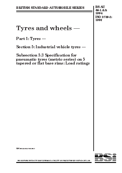 Tyres and wheels. Tyres. Industrial vehicle tyres Specification for pneumatic (metric series) on 5° tapered or flat base rims: load ratings