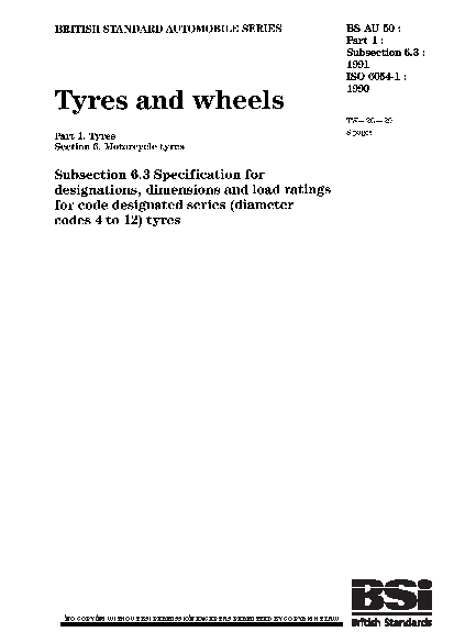 Tyres and wheels. Tyres. Motorcycle tyres Specification for designations, dimensions load ratings code designated series (diameter codes 4 to 12)