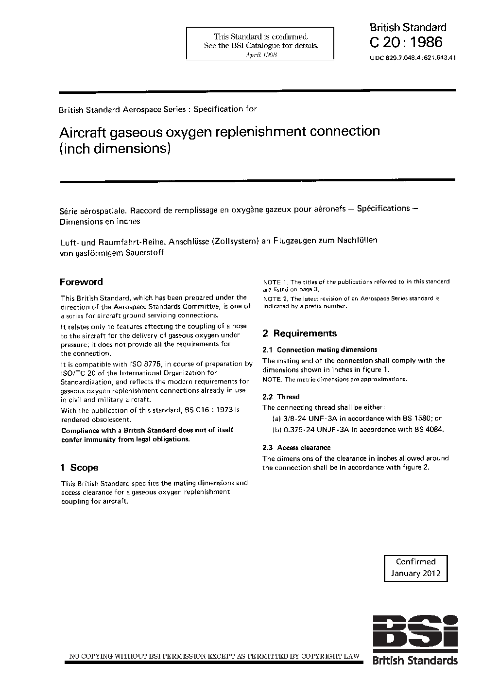 Aircraft ground servicing;Oxygen;Air transport engineering;Pipe fittings;Hose connectors;Unions;Detachable unions;Threads;Aircraft components;Clearances;Screwed fittings;Pipe couplings;Dimensions;Pipe connections;Pressure equipment