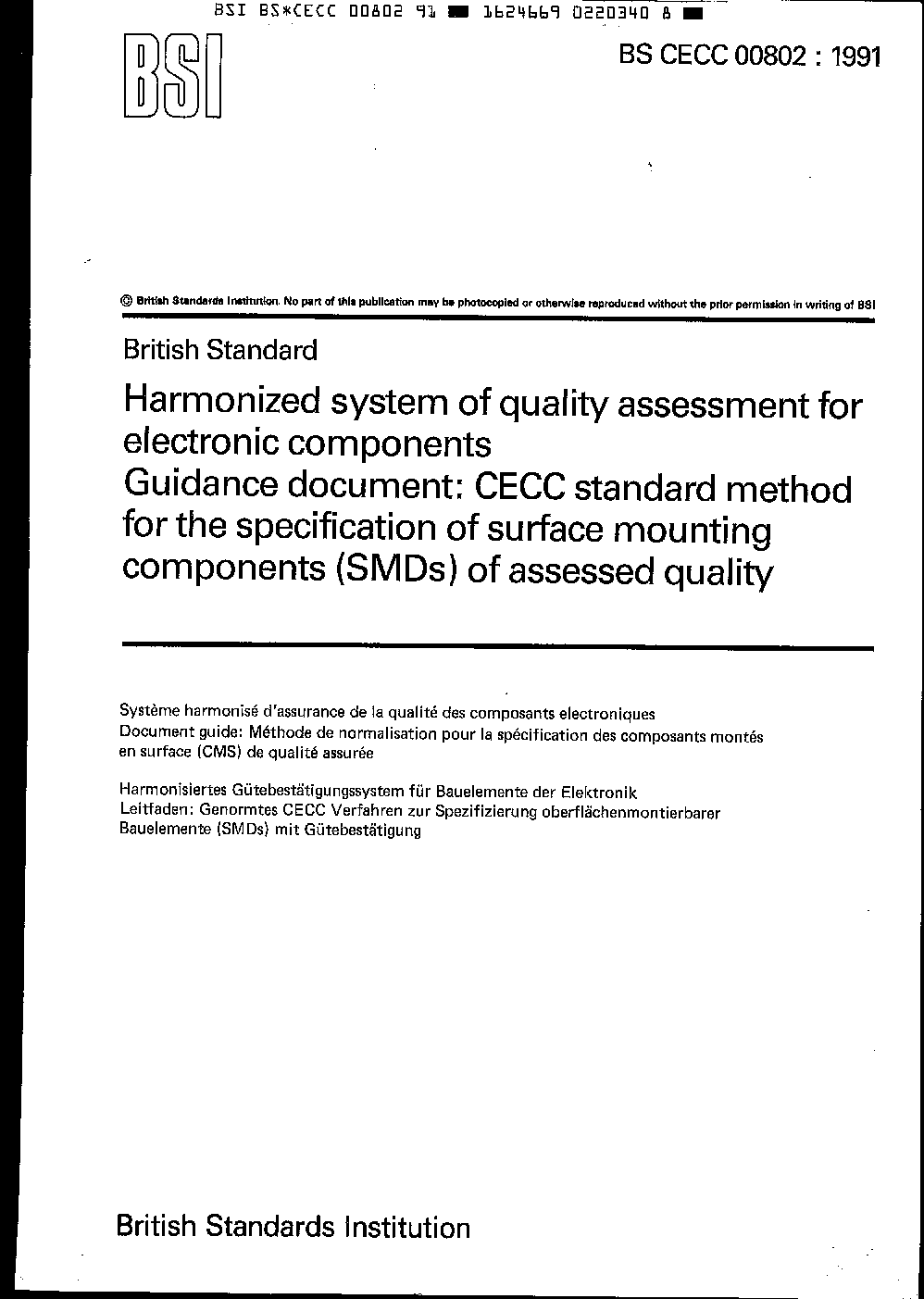 Harmonized system of quality assessment for electronic components. Guidance document: CECC standard method for the specification of surface mounting components (SMDs) of assessed quality
