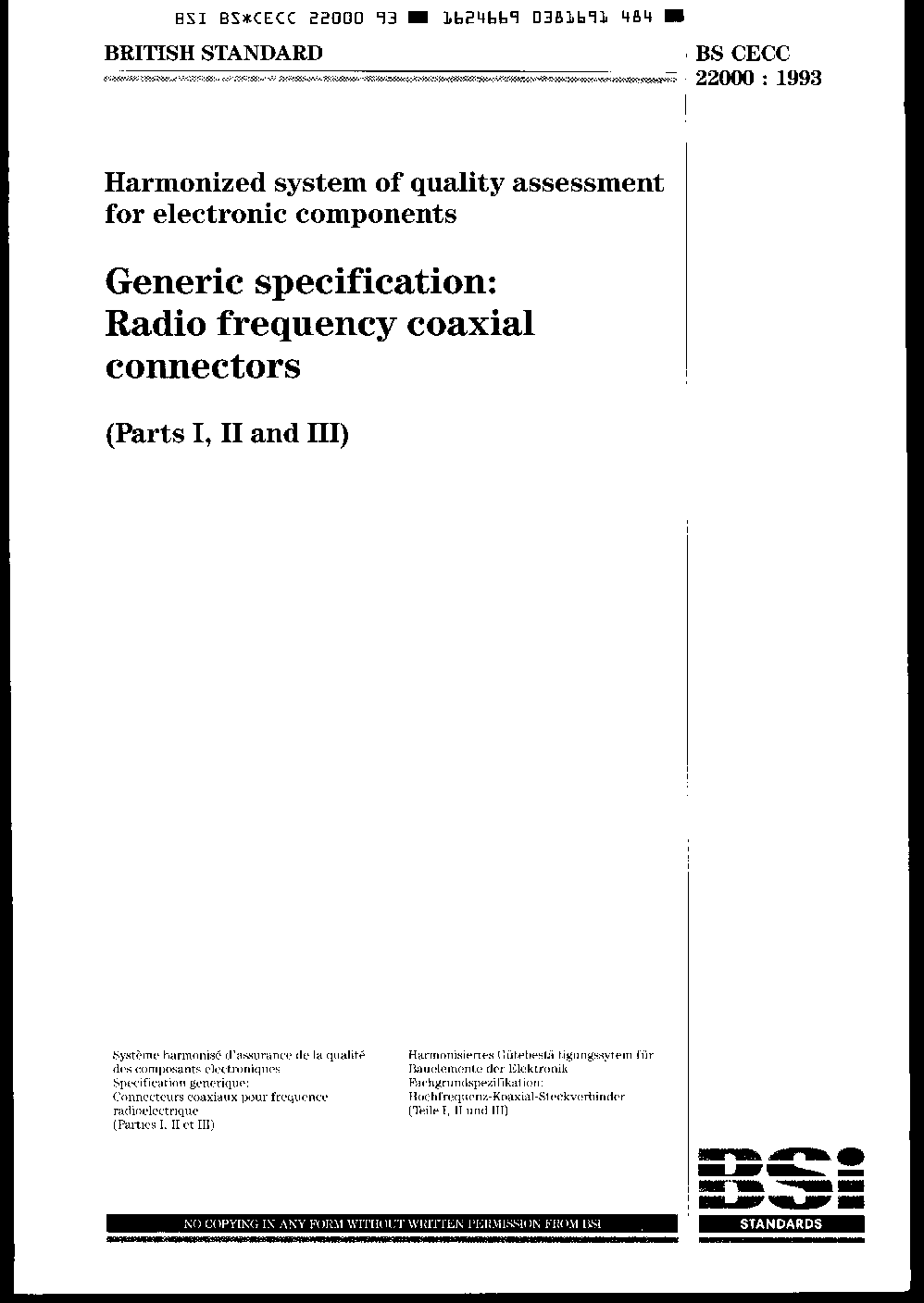 Harmonized system of quality assessment for electronic components: generic specification: radio frequency coaxial connectors