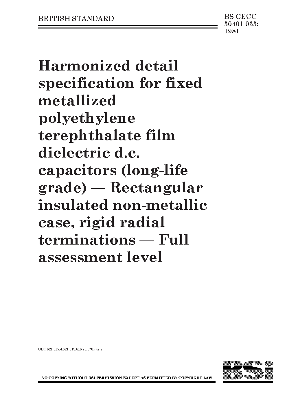 Harmonized detail specification for fixed metallized polyethylene terephthalate film dielectric d.c. capacitors (long-life grade). Rectangular insulated non-metallic case, rigid radial terminations. Full assessment level