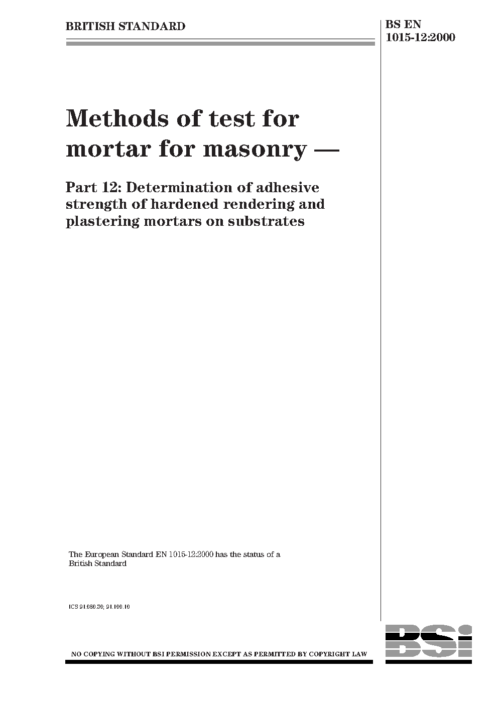 Methods of test for mortar masonry Determination adhesive strength hardened rendering and plastering mortars on substrates