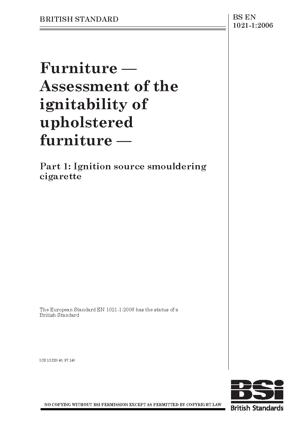 Furniture. Assessment of the ignitability upholstered furniture Ignition source smouldering cigarette