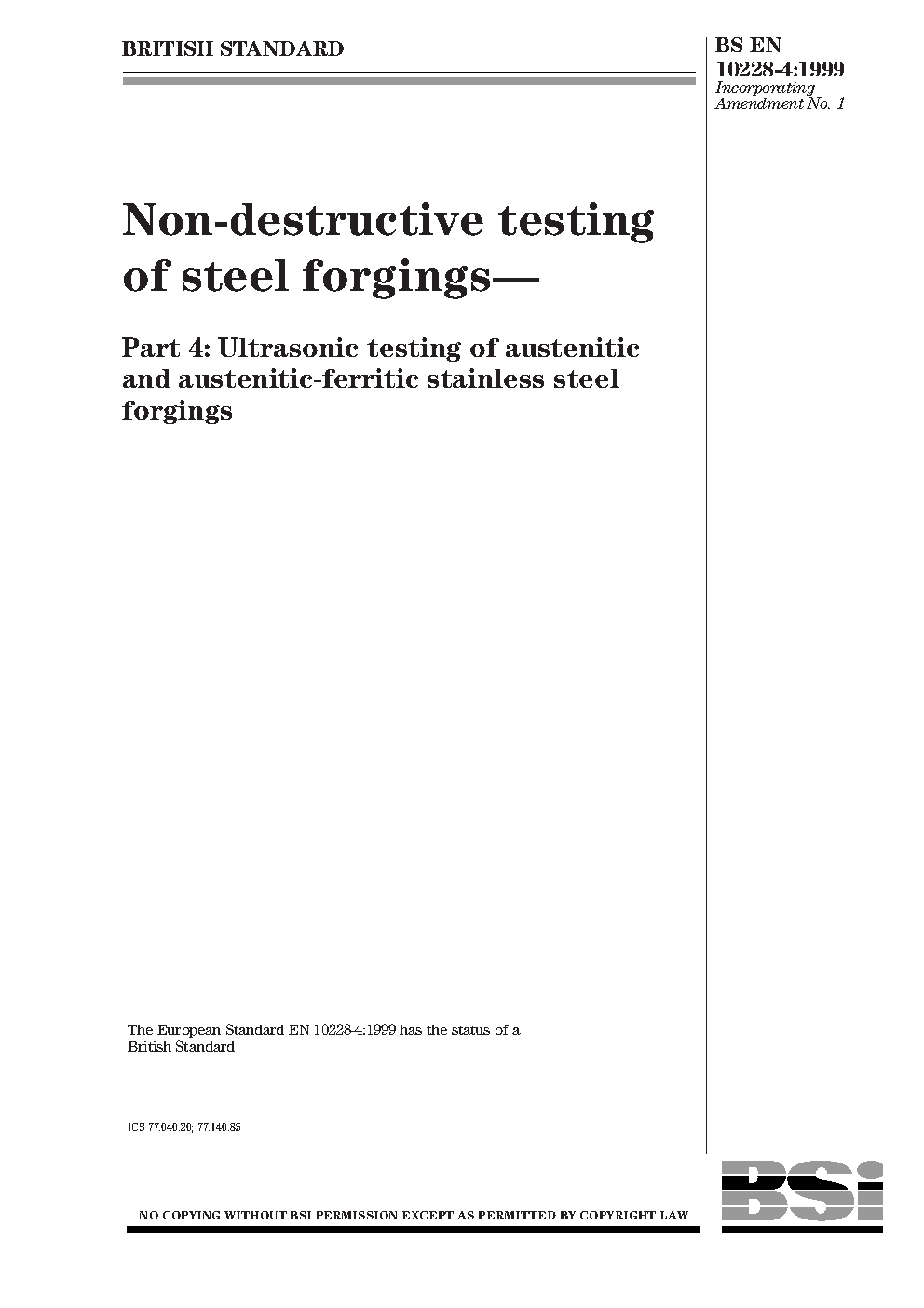 Test equipment;Quality;Grades (quality);Reverberation;Stainless steels;Thickness;Ultrasonic testing;Steels;Angles (geometry);Amplitude;Patterns;Test specimens;Non-destructive testing;Surface properties;Probes;Acceptance (approval);Surfaces;Consumer-supplier relations;Shape;Testing conditions;Ferritic steels;Forgings;Sensitivity;Depth;Dimensions;Austenitic steels;Classification systems