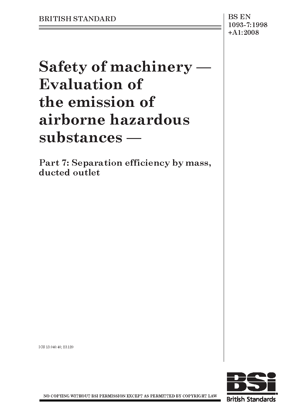 Safety of machinery. Evaluation the emission airborne hazardous substances Separation efficiency by mass, ducted outlet