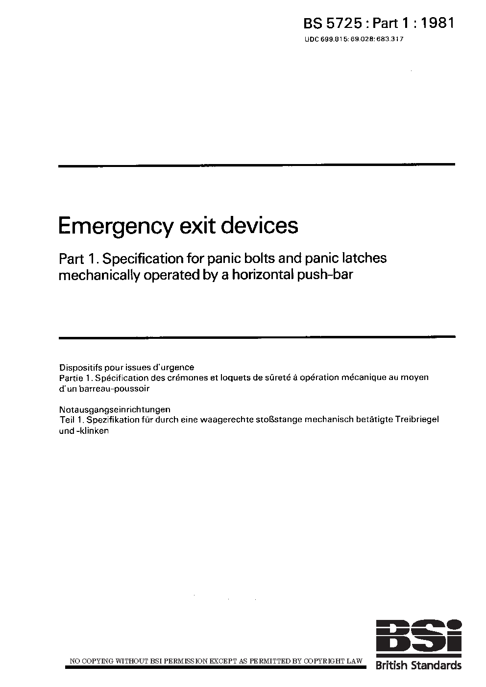 Building hardware. Panic exit devices operated by a horizontal bar. Requirements and test methods