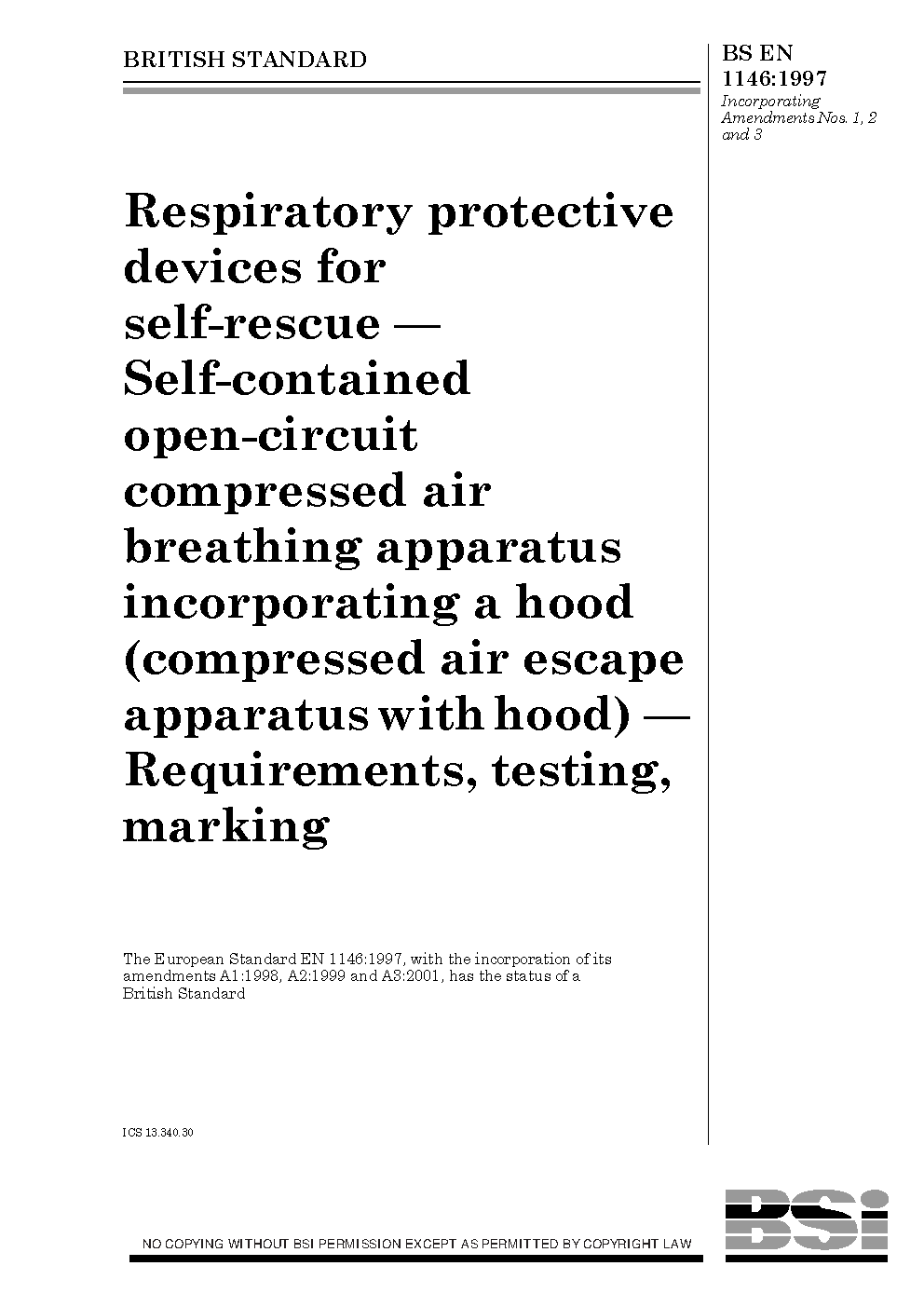 Protective clothing;Respirators;Performance testing;Supplied air breathing apparatus;Breathing apparatus;Escape;Instructions for use;Marking;Compressed air;Masks (protective clothing);Rescue equipment;Performance
