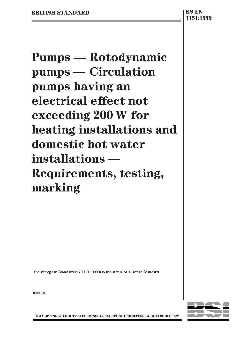 Pumps. Rotodynamic pumps. Circulation pumps having an electrical effect not exceeding 200 W for heating installations and domestic hot water installations. Requirements, testing, marking