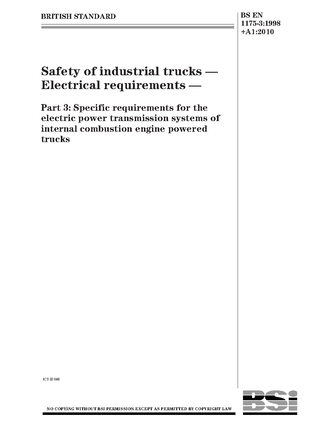 Electrical safety;Accident prevention;Lead-acid batteries;Rated current;Electrical resistance;Battery-powered devices;Hazards;Electric enclosures;Environment (working);Overload (electric);Nickel-cadmium batteries;Circuits;Safety measures;Rated voltage;Environmental testing;Protected electrical equipment;Industrial trucks;Electrical testing;Control systems;Containers;Electric connectors;Temperature measurement;Velocity;Dielectric-strength tests;Overspeed tests;Control equipment;Switches;Temperature-rise limit;Electrically-operated devices;Instructions for use;Cold tests;Chemical-resistance tests;Materials handling equipment;Electric cells;Endurance testing;Drop tests;Electrical insulation;Testing conditions;Occupational safety;Electric conductors;Powered industrial trucks;Electrical components;Type testing