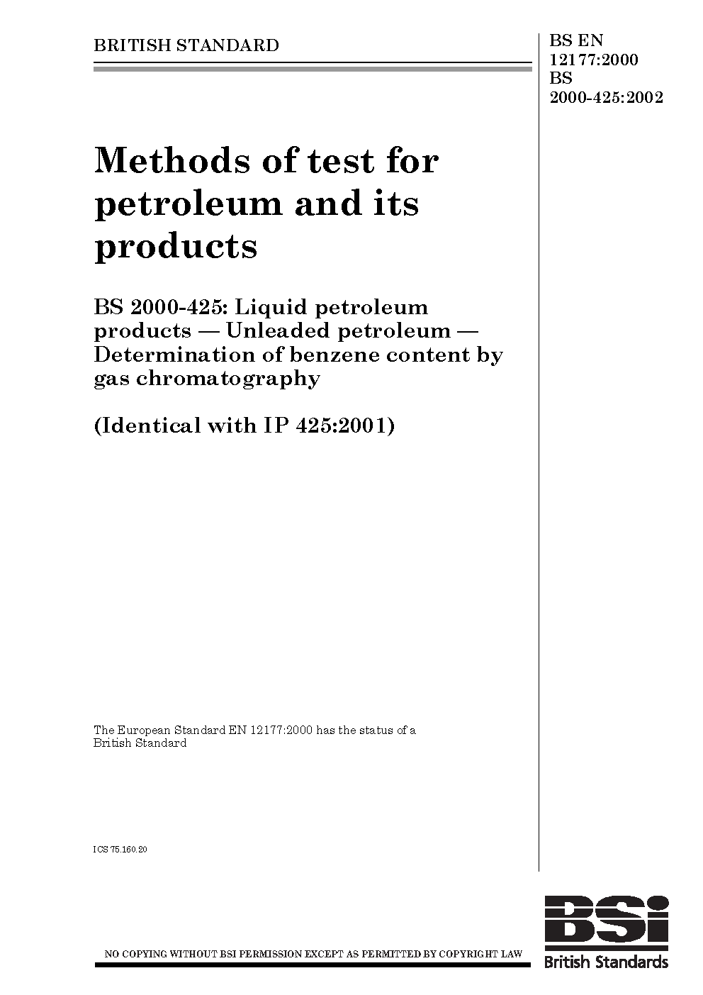 Methods of test for petroleum and its products. Liquid petroleum products. Unleaded petroleum. Determination of benzene content by gas chromatography
